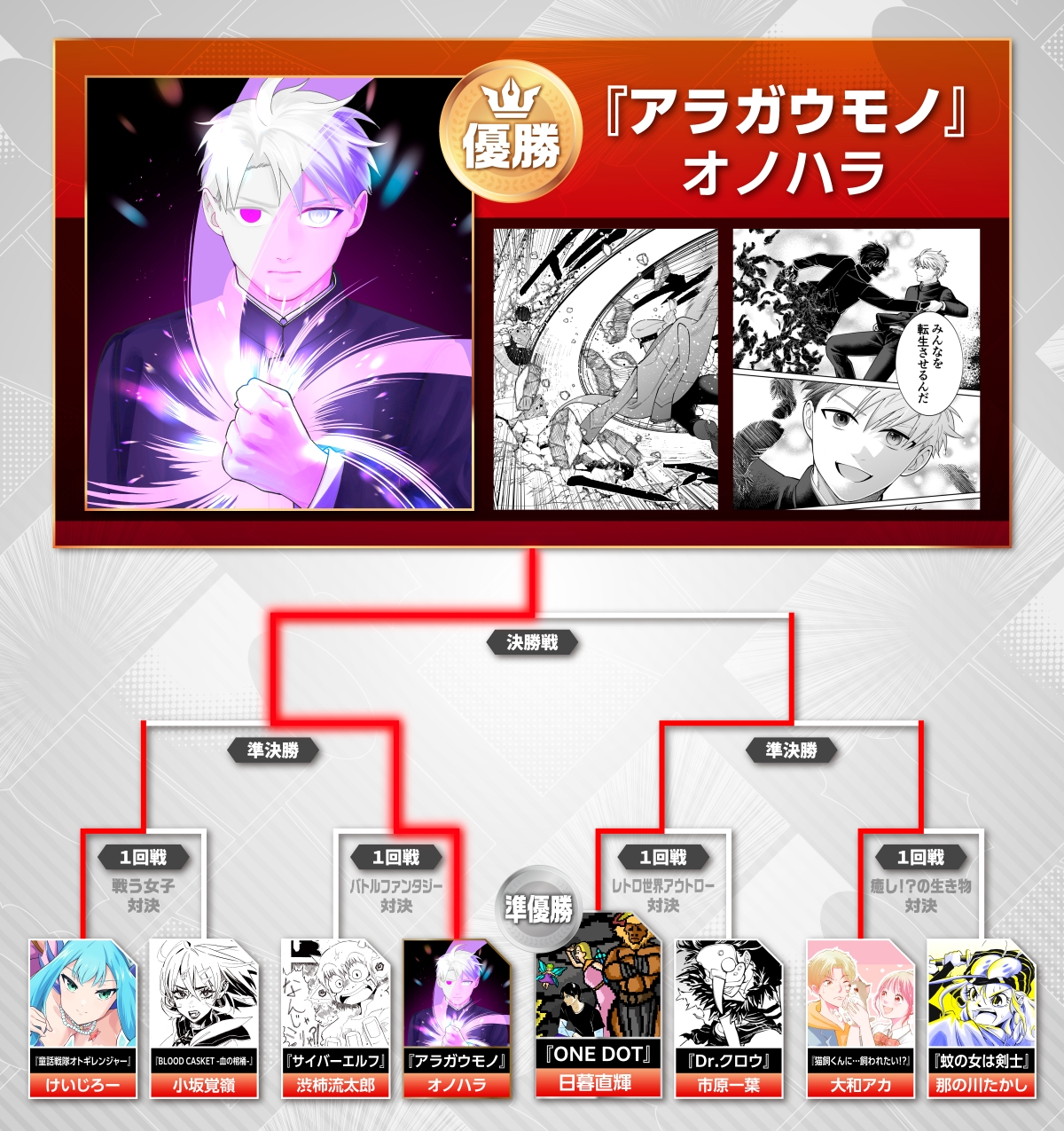予選を勝ち抜いた8作品の漫画がトーナメント形式でガチバトル! 初戦は各作品の第1話どうしで対決。勝ち進むと今度は第2話どうしの対決、そして最終決戦は第3話かつ最終話対決。つまり勝ち進むことで“短期連載を完成させる”ことができるシステムです。